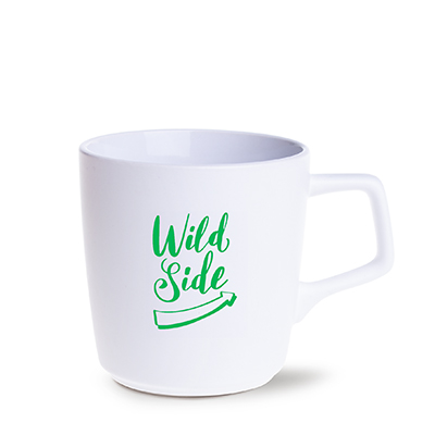Biały kubek z charakterystycznym uchem w kształcie wieloboku.