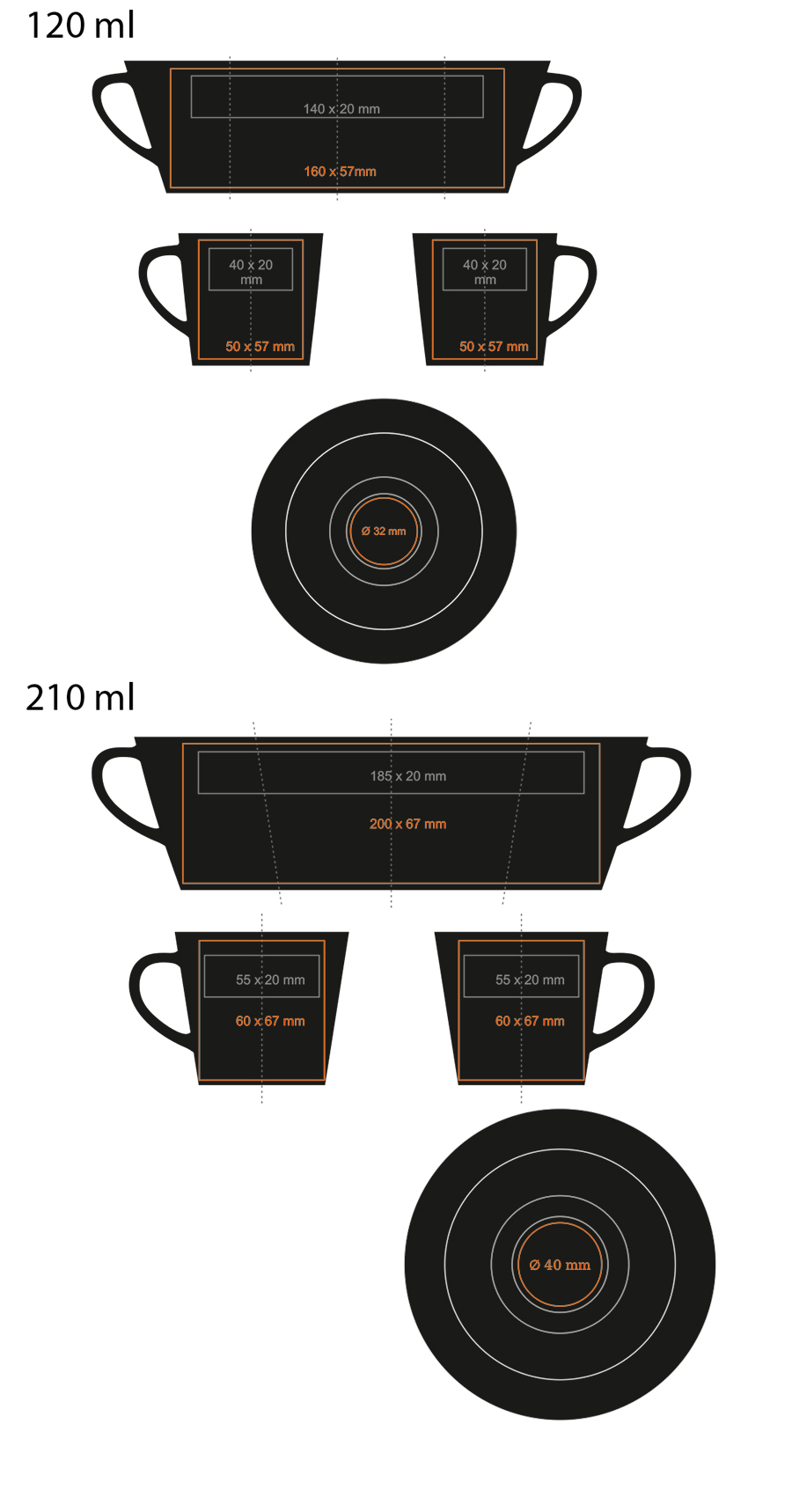 Filiżanka w czarnym kolorze, o prostym, klasycznym kształcie. Wykonana z porcelany. Posiada ergonomiczne ucho i duże pole w zakresie nanoszenia zdobień. Występuje w dwóch pojemnościach.
